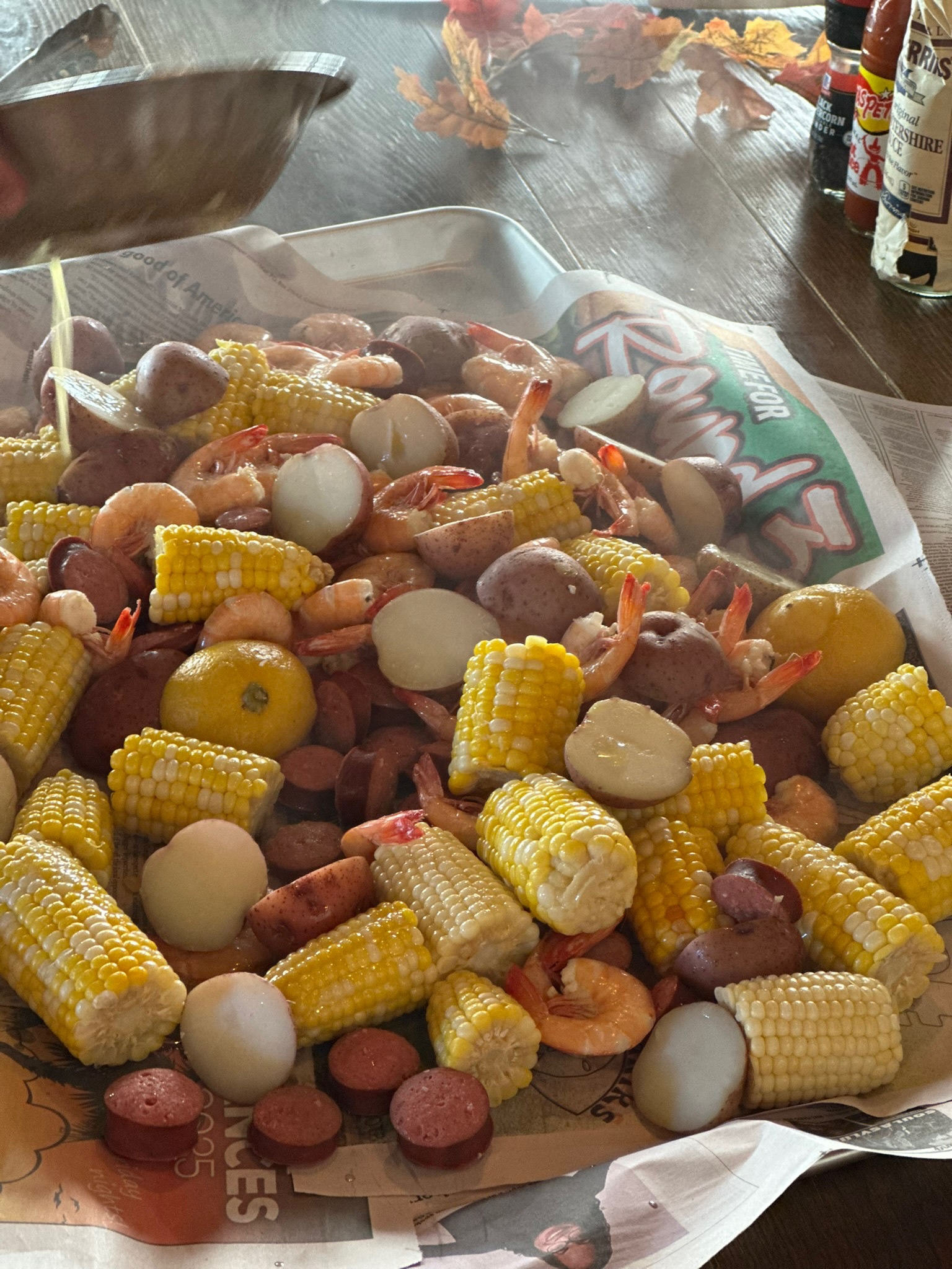 - A shared feast of shrimp, sausage, potatoes, and corn served straight from the pot